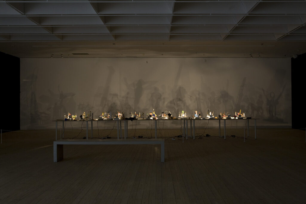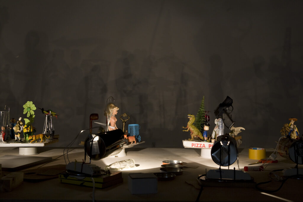 I Hans-Peter Feldmanns verk Schattenspiel (Skuggspel) från 2002 placerar han funna leksaker, souvenirer och prydnadsföremål på långsamt roterande plattformar. Enkla lampor projicerar deras skuggor i en cyklisk karusell mot väggen bakom. Skuggfigurerna vävs in och ut ur varandra, smälter in i varandra i ständigt skiftande kombinationer och skapar en magisk skuggvärld. Feldmann försöker inte dölja de funna föremålen, de roterande skivorna, elsladdarna eller lamporna, utan istället, precis som i konstnärens böcker, använder han enkla knep, visar upp det han hittat och skänker de funna föremålen nytt liv.
